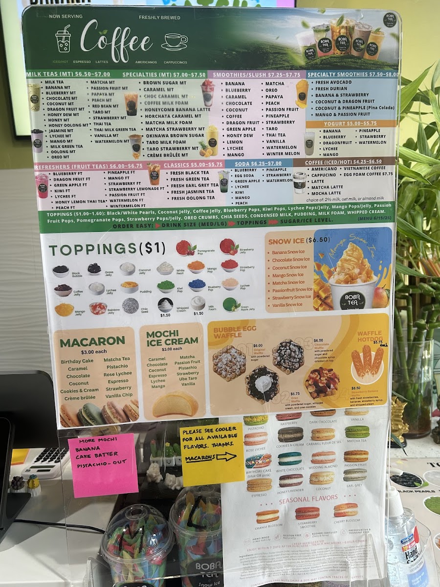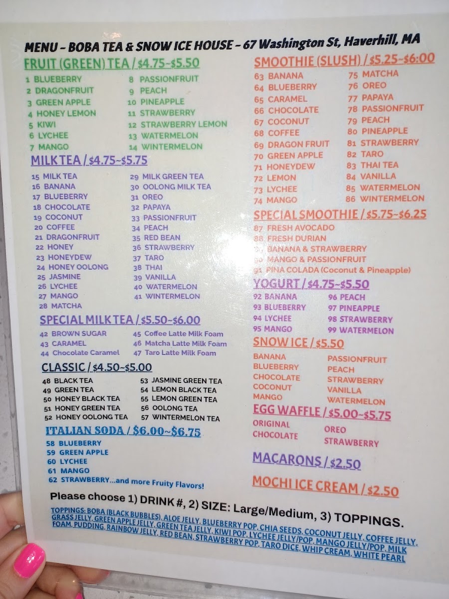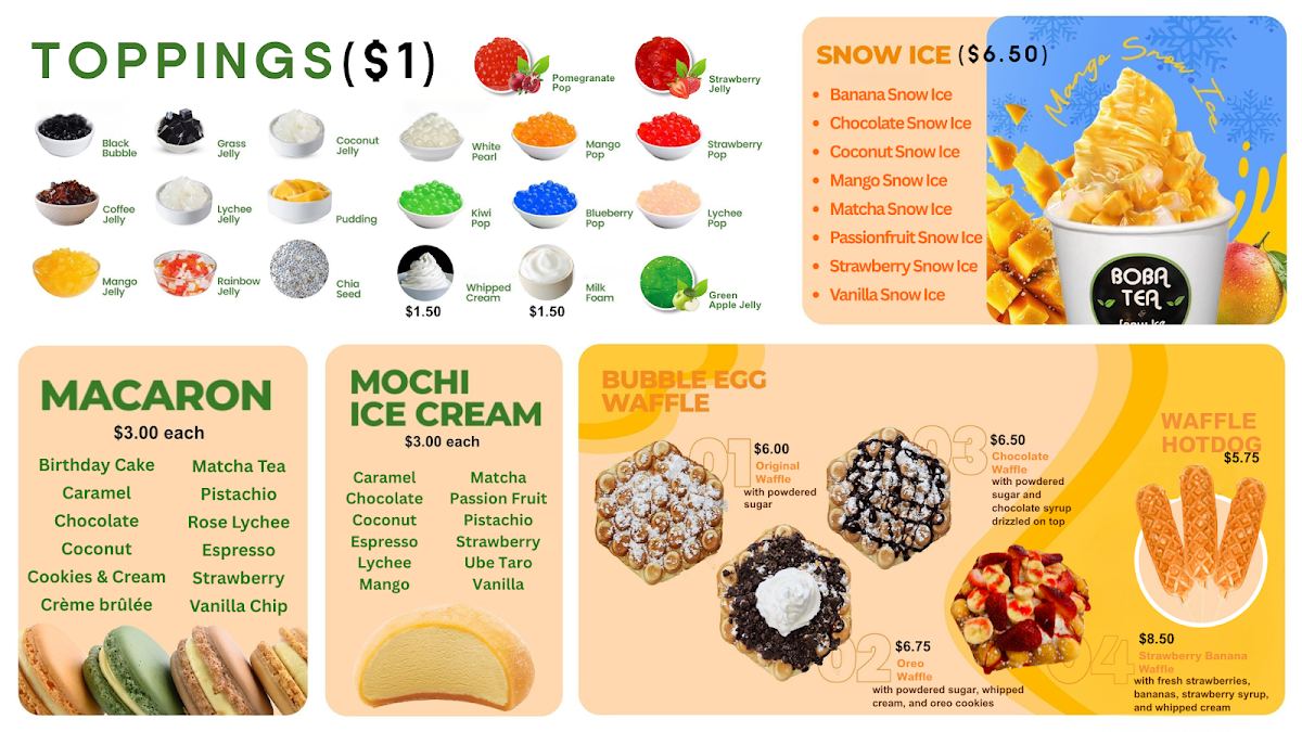 Boba Tea And Snow Ice House in Haverhill impresses with a menu that balances classic favorites with inventive twists. For tea lovers, the Milk Teas offer familiar comforts like Milk Tea, Banana MT, and Coconut MT, alongside Specialty Milk Teas such as Brown Sugar MT, Butterfly Pea Matcha MT, and the indulgent Choc Caramel MT. Those seeking refreshing options can enjoy the Fruit Teas, including Blueberry FT, Dragon Fruit FT, and Honey Lemon Thai Tea. The Classics lineup-Fresh Black Tea, Fresh Green Tea, and Fresh Oolong Tea-delivers simplicity done right. For something more blended, the Smoothies/Slush menu features Banana, CaramelChocolate, and Coconut, while the Specialty Smoothies like Fresh Avocado and Coconut & Pineapple (Pina Colada) elevate the experience. Yogurt-based drinks such as DragonfruitLychee and Mango add a tangy sweetness. Coffee enthusiasts are treated to Americano, Latte, and Vietnamese Coffee, including the creamy Egg Foam Coffee. The dessert selection shines with Snow Ice flavors like Matcha Snow Ice and Mango Snow Ice, complemented by Macarons in Birthday Cake, Caramel, and Cookies & Cream, and Mochi Ice Cream varieties such as Cake Batter and Chocolate. The inventive Bubble Egg Waffles, from Original Egg Waffle to Strawberry Banana Egg Waffle and Waffle Hotdog, are both visually playful and satisfying. For those who love customization, a wide range of Toppings-Black Pearls, Mango Pop, and Passionfruit Pop-allows each drink to be tailored to taste. Overall, the menu at Boba Tea And Snow Ice House offers a versatile mix of drinks and desserts that caters to both traditional preferences and adventurous palates, making it a spot where each visit can bring a new favorite.