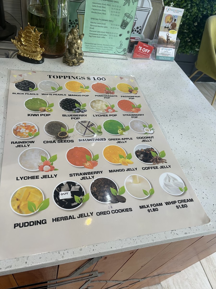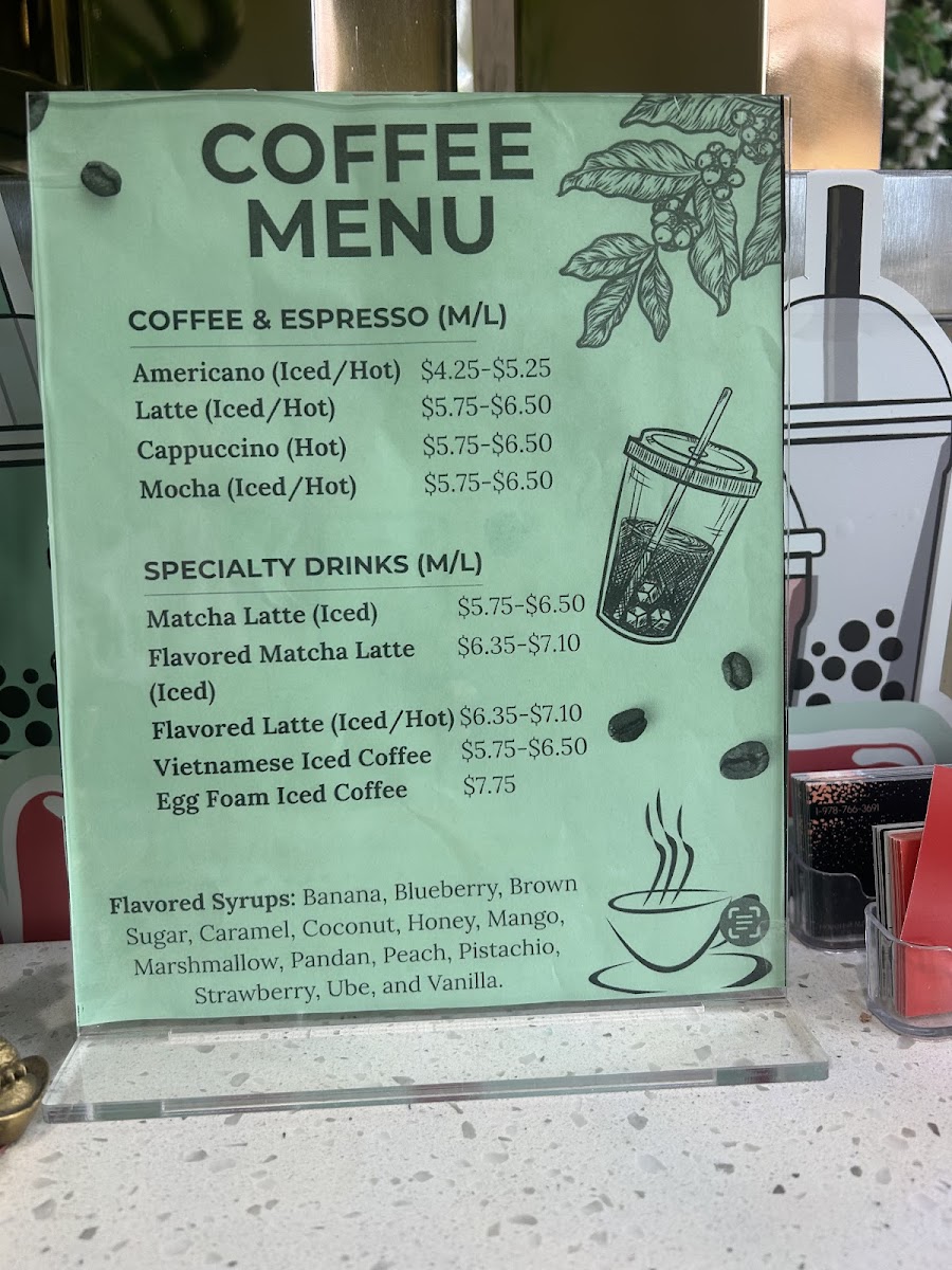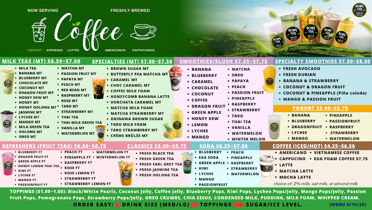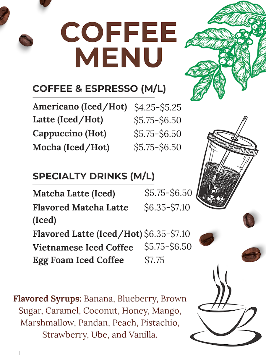Boba Tea And Snow Ice House in Haverhill impresses with a menu that balances classic favorites with inventive twists. For tea lovers, the Milk Teas offer familiar comforts like Milk Tea, Banana MT, and Coconut MT, alongside Specialty Milk Teas such as Brown Sugar MT, Butterfly Pea Matcha MT, and the indulgent Choc Caramel MT. Those seeking refreshing options can enjoy the Fruit Teas, including Blueberry FT, Dragon Fruit FT, and Honey Lemon Thai Tea. The Classics lineup-Fresh Black Tea, Fresh Green Tea, and Fresh Oolong Tea-delivers simplicity done right. For something more blended, the Smoothies/Slush menu features Banana, CaramelChocolate, and Coconut, while the Specialty Smoothies like Fresh Avocado and Coconut & Pineapple (Pina Colada) elevate the experience. Yogurt-based drinks such as DragonfruitLychee and Mango add a tangy sweetness. Coffee enthusiasts are treated to Americano, Latte, and Vietnamese Coffee, including the creamy Egg Foam Coffee. The dessert selection shines with Snow Ice flavors like Matcha Snow Ice and Mango Snow Ice, complemented by Macarons in Birthday Cake, Caramel, and Cookies & Cream, and Mochi Ice Cream varieties such as Cake Batter and Chocolate. The inventive Bubble Egg Waffles, from Original Egg Waffle to Strawberry Banana Egg Waffle and Waffle Hotdog, are both visually playful and satisfying. For those who love customization, a wide range of Toppings-Black Pearls, Mango Pop, and Passionfruit Pop-allows each drink to be tailored to taste. Overall, the menu at Boba Tea And Snow Ice House offers a versatile mix of drinks and desserts that caters to both traditional preferences and adventurous palates, making it a spot where each visit can bring a new favorite.